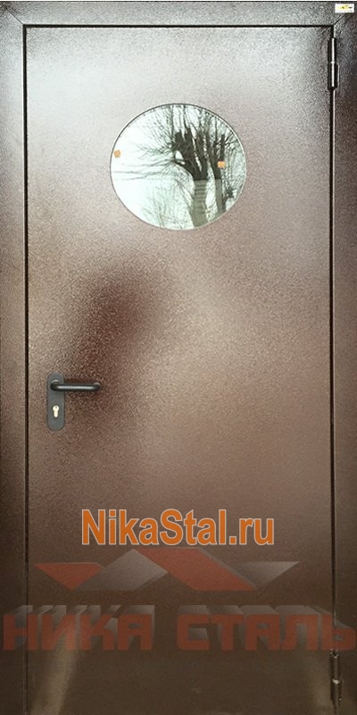Коричневая противопожарная дверь из оцинкованной стали с круглым стеклом Арт-160